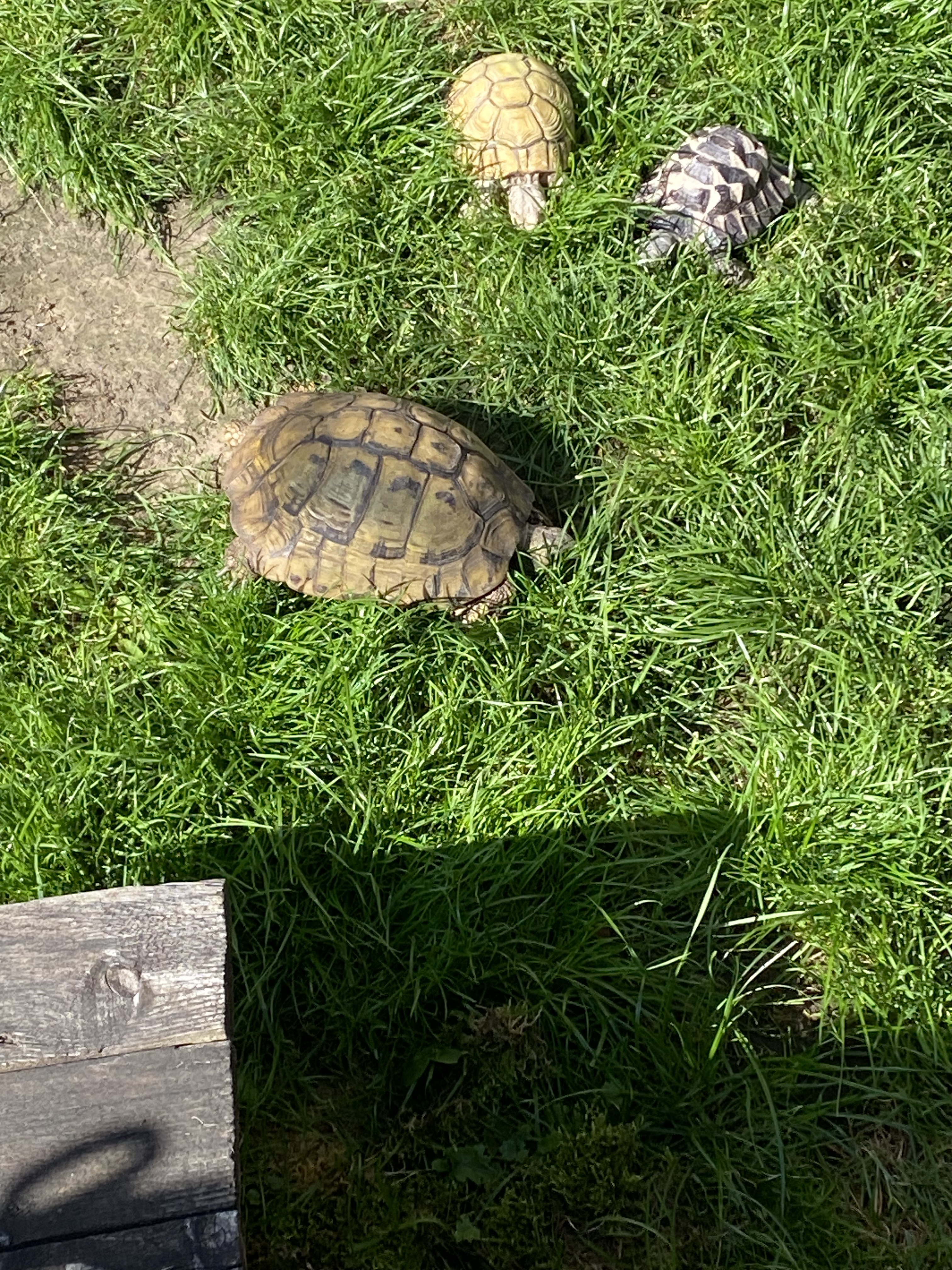 Three turtles in a garden.